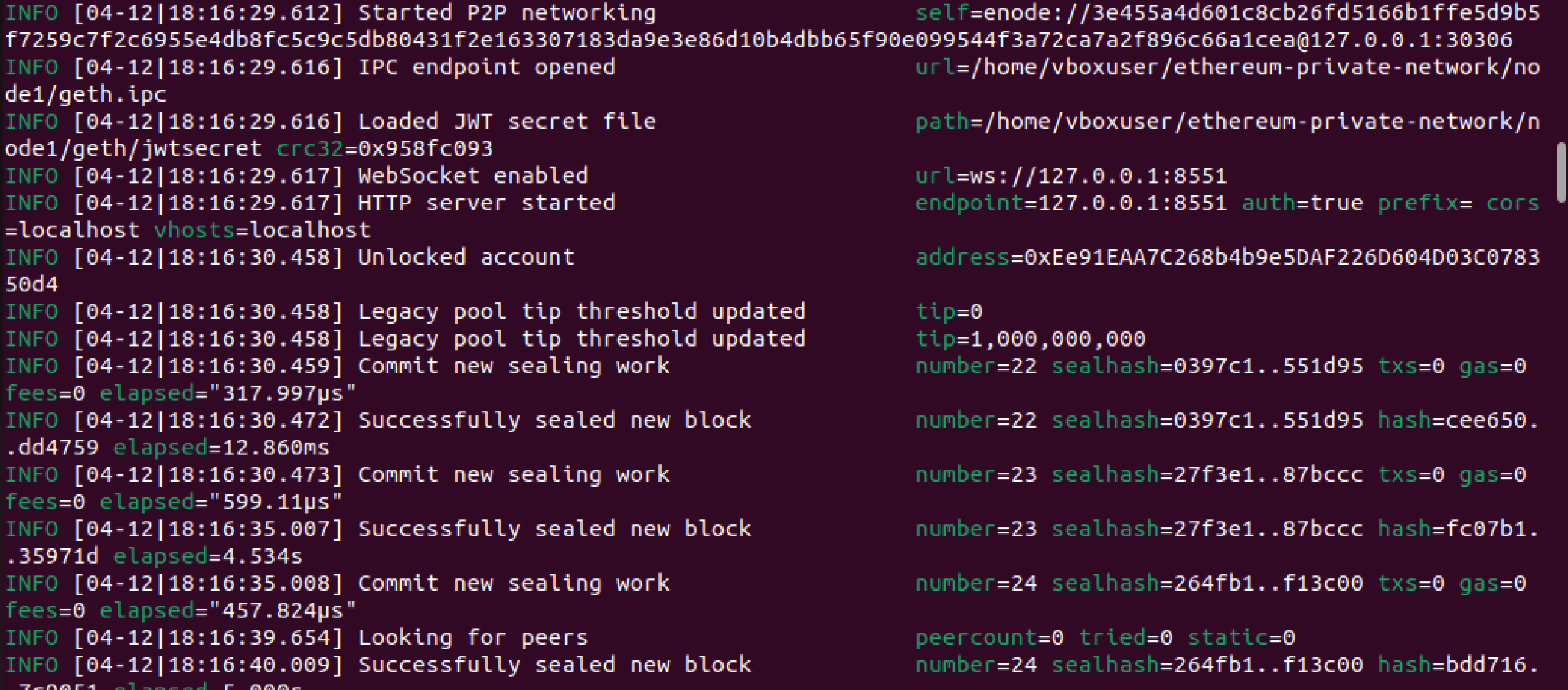 geth --datadir node1 --port 30306 --bootnodes enode://7dd2cc0bd0f65c7ed9de6f3c2a9e22258782c02df8b768f3b809fa21cc1247b0c4d73f44146219ef9091ce9f878a934d13e2dbb818e807d103d947f6982d1b42@127.0.0.1:0?discport=30305 --networkid 123454321 --unlock 0xEe91EAA7C268b4b9e5DAF226D604D03C078350d4 --password node1/password.txt --authrpc.port 8551 --mine --miner.etherbase 0xEe91EAA7C268b4b9e5DAF226D604D03C078350d4